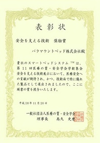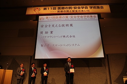 ベッドサイドケア情報統合システム「スマートベッドシステム™」が、「第11回 医療の質・安全学会学術集会」(2016年11月19日~20日、幕張メッセ国際会議場)において、医療安全を支える製品を表彰する技術展の最高位である「奨励賞」を受賞しました。当学術集会は、患者本位の質と安全を提供する新しい医療システムの実現を目的として、毎年開催されています。