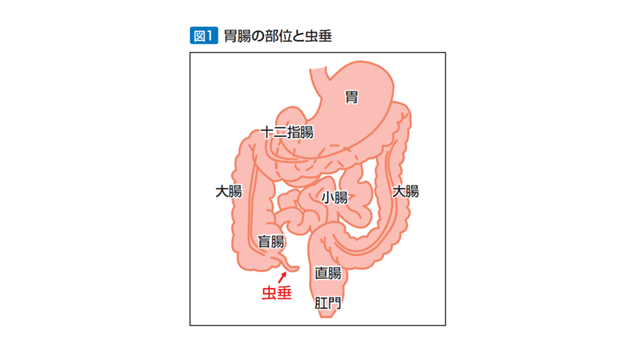 虫垂は大腸の一番奥の盲腸という部分にある細長い袋状の臓器で、右下腹部に位置しています図1参照)。太さは4〜5㎜、長さは5~8㎝程度です。