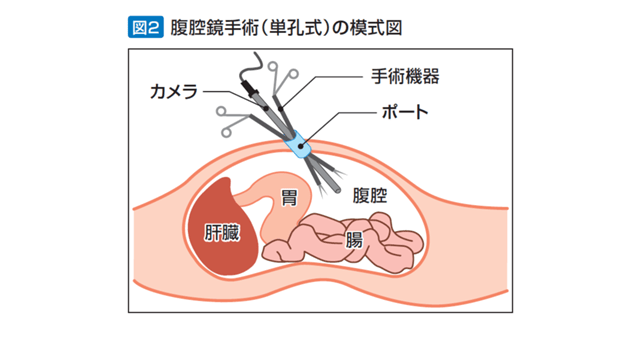 手術法も格段に進歩しています。かつては、お腹を完全に開く開腹手術が中心でした。その後、おへその穴に加え、お腹に2つの穴を開けて行う3孔式の腹腔鏡手術が普及、入院期間も短縮化されました。そして現在では、おへその穴1カ所だけを用いる単孔式の腹腔鏡手術が普及し始めています(図2)。