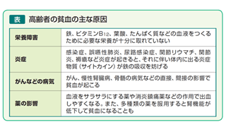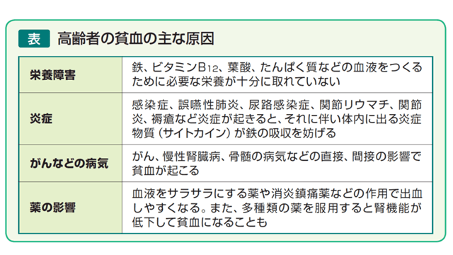「高齢者に多い誤嚥性肺炎や、尿路感染症、関節リウマチ、関節炎、褥瘡など、体の中で慢性の炎症が起きていると、貧血を起こしやすくなります。炎症が貧血の原因になるのは、炎症に伴って体内に出てくる炎症物質(サイトカイン)が、鉄分の吸収を妨げてしまうからです」(田中先生)。高齢者では「がんなどの病気」も貧血の大きな原因になります。がん組織からの出血やがんに伴う炎症が引き金となります。