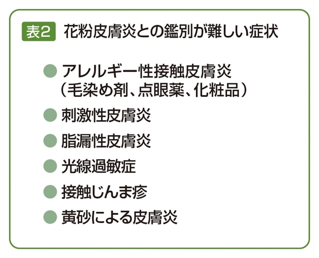 花粉皮膚炎の診断では、皮膚症状の部位と症状を診ていきますが、横関先生は「眼の周りや頬の発赤といった症状が表れた場合には、鑑別が難しい症状もあります。素人判断はせず、早めに皮膚科の専門医を受診するようにしてください」と言います。鑑別が難しい例として横関先生は、毛染め剤や点眼薬によるアレルギー性接触皮膚炎、アイライナーや美容液による接触皮膚炎、脂漏性皮膚炎、光線過敏症、接触じんま疹、黄砂による皮膚炎などを挙げます(表2)。