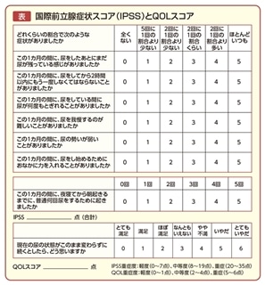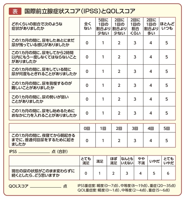 前立腺肥大症の診断は泌尿器科で行います。その際に用いられるのは、「国際前立腺症状スコア(IPSS)とQOLスコア」(表)です。これらを参考に、尿流測定、残尿測定、超音波検査などから確定診断を行います。その他、排尿時刻と排尿量を記録してもらう「排尿日誌」を用いることもあります。