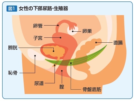 骨盤底筋は分娩時、腟を直径約10cmの頭の赤ちゃんが通過するなどしてダメージを受けます。また加齢で女性ホルモンが減ると、筋力が落ちて骨盤底筋が緩んできます。そうした状態で、せきやくしゃみをしたり、重い荷物を持って踏み込んだりして、お腹に力(腹圧)がかかった時に少量の尿が漏れてしまうのが腹圧性尿失禁です。