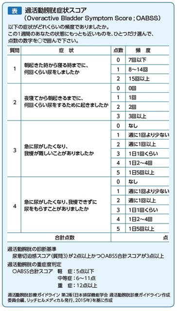 過活動膀胱の診断には「過活動膀胱症状スコア(OABSS)」と呼ばれる質問票が用いられます(表)。「質問票を参考にしながら、同じような症状が出る、細菌性膀胱炎や、間質性膀胱炎、膀胱結石、膀胱がんを除外して診断を下します」(髙橋先生)。