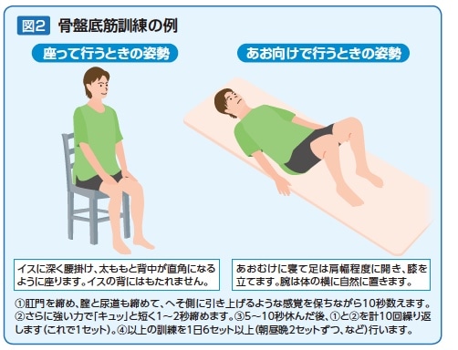 過活動膀胱の治療では、行動療法として後でも述べる「骨盤底筋訓練(図2)」と「膀胱訓練(強い尿意を感じた時に我慢し膀胱に尿を溜める訓練)」をまず指導すると髙橋先生は話します。