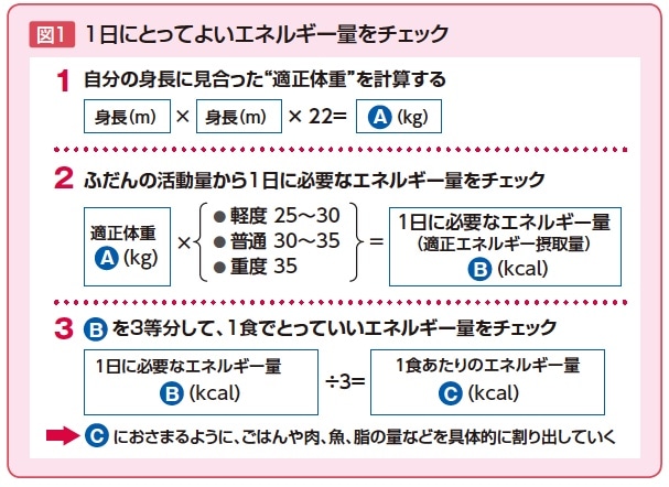 野本さんは「中性脂肪が高値となる主な原因はエネルギー量のとりすぎです。BMIが高いということは、食事でとっているエネルギー量が消費量より多くバランスが悪いことを示しています。これを改善するには、まず身長や体重、日ごろの運動量などから、1日に必要なエネルギー量を計算し、そこから1食あたり何をどれくらい食べればよいかを確かめて、食事を見直しましょう」と言います(図1)。