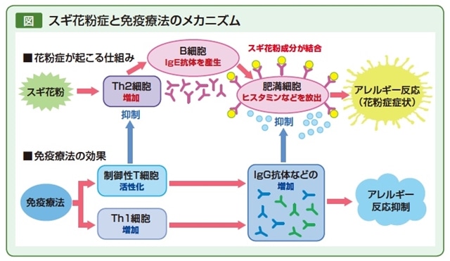 スギ花粉症では、大量の花粉を鼻などから吸い込むとアレルギー反応を促進するTh2細胞が増えて、B細胞でスギ花粉アレルゲンを捕まえるIgE抗体がたくさんつくられ、肥満細胞などの表面にくっつきます。そこにスギ花粉アレルゲンが結合すると肥満細胞からはヒスタミンなどの化学物質が放出され、これがアレルギー症状を引き起こしています(図上段)。