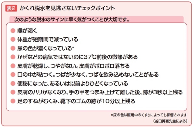 高齢者の周りにいる人が気をつける点について、谷口先生は「食欲が普段より落ちている、または、食事以外の水分摂取量が減っている場合には要注意です。かつ、疲れやすい、身体のどこかが痛い、何となく体調不良である、の3つの症状のうちのどれかがあったらかくれ脱水が起きている可能性が高くなります」と話します。