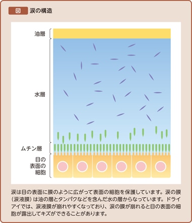 目の表面に広がる涙は、一枚の膜のようになって目の表面全体を覆い(涙液膜)、目の表面の細胞を保護しています。涙液はただの水のように見えますが、実は意外に複雑な構造になっています。大きく分けて、ごく薄い「油の層」とタンパクなどを含んだ「水の層」からなっています(図)。