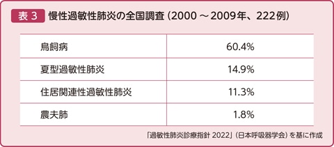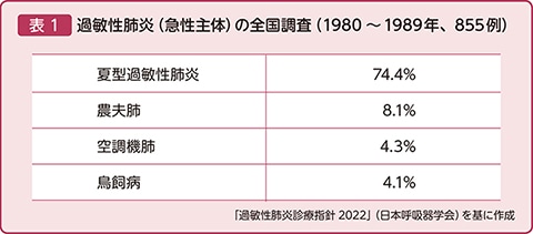 全国調査によれば、急性過敏性肺炎の内訳は、夏型過敏性肺炎が74.4%、農夫肺が8.1%、空調機肺(空調機や加湿器を原因とする肺炎)が4.3%、鳥飼病(鳥関連過敏性肺炎の別名称)が4.1%となっています。近年、空調機肺が増加傾向とされています。