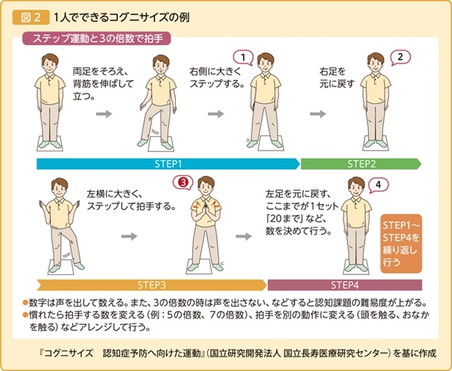 コグニサイズとは、コグニション(cognition、認知)とエクササイズ(exercise、運動)を合わせた造語で、認知課題と身体活動とを組み合わせたプログラムのことです。図2は代表的なプログラムの一つ「コグニステップ」です。足踏みをしながら3の倍数の時に拍手をするというもので、拍手のタイミングで頭を使うのがポイントです。コグニサイズにはウォーキングをしながらしりとりや計算を行うコグニウォーク、はしごの形をした布テープを床において様々なステップを行うコグニラダーなど、多種多様なプログラ厶が用意されています。