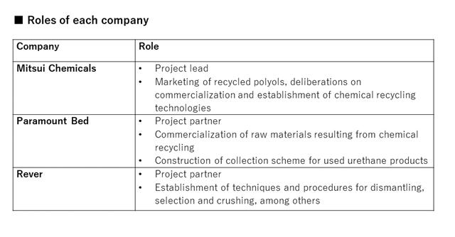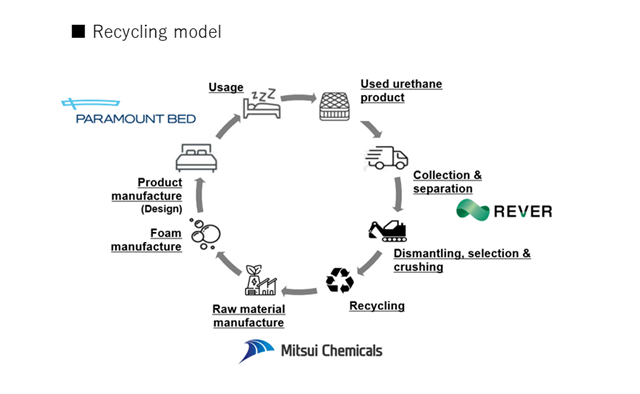 Paramount Bed Co., Ltd. (Tokyo: 7817; President & CEO: KIMURA Tomohiko), Mitsui Chemicals, Inc. (Tokyo: 4183; President & CEO: HASHIMOTO Osamu) and Rever Corporation (Tokyo: 9247; President: MATSUOKA Naoto/TRE HOLDINGS CORPORATION) today announced that the Ministry of the Environment (MOE) has selected their initiative aimed at the chemical recycling of polyurethane in mattresses for inclusion in the MOE’s FY2023 Project to Encourage Construction of Decarbonized Circular Economy Systems.*1 Following a call for submissions, the scheme has been adopted in the category for demonstration projects aimed at constructing plastic recycling processes and reducing CO2 emissions.