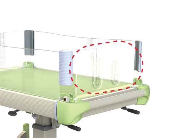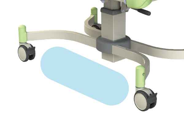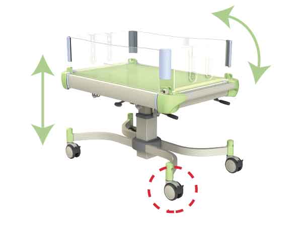 The bassinet height can be adjusted (859 to 1,109mm) to allow for easy transportation and changing of diapers. The Inclination angle can be adjusted (0 to 6degree) by a gas spring lever operation to a desired position for easy handling and smooth motion. Smooth rotating 100mm dia. casters with stoppers at each corner provide quiet movement.