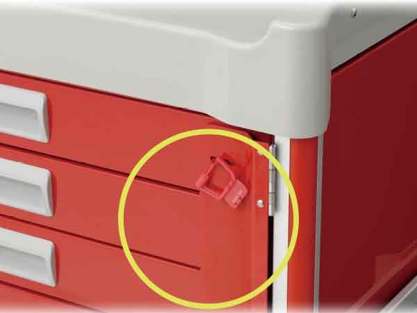 An original and disposable one-time serial lock can be used for the effective management of emergency care items. The lock can be set in place once all medication and other diagnostic materials have been placed in the cart. Thus, there is no need to re-check cart contents while it is sealed. Medical personnel can have quick access to the contents of the cart by easily removing the lock.