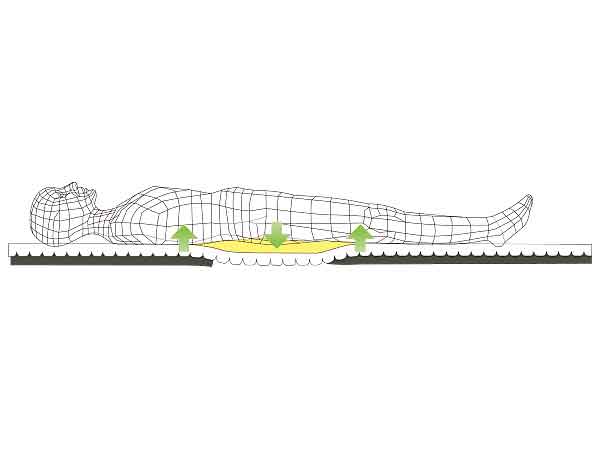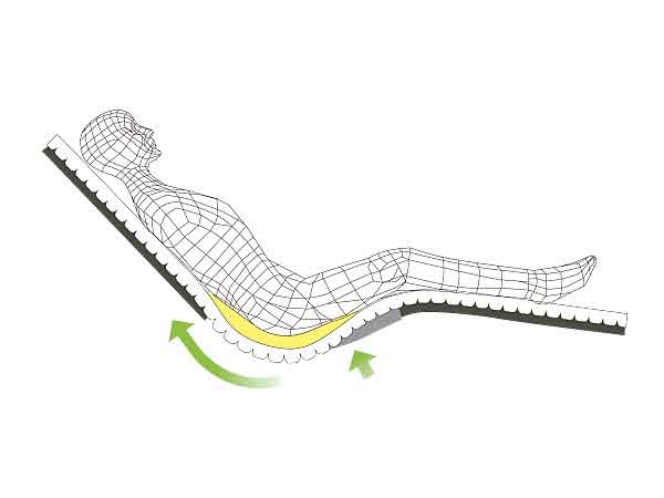 Stretch and expand to accommodate movement during back raising operation by unique "Cross-line Structure" which comes wave-shaped polyester material envelops the posterior region.
