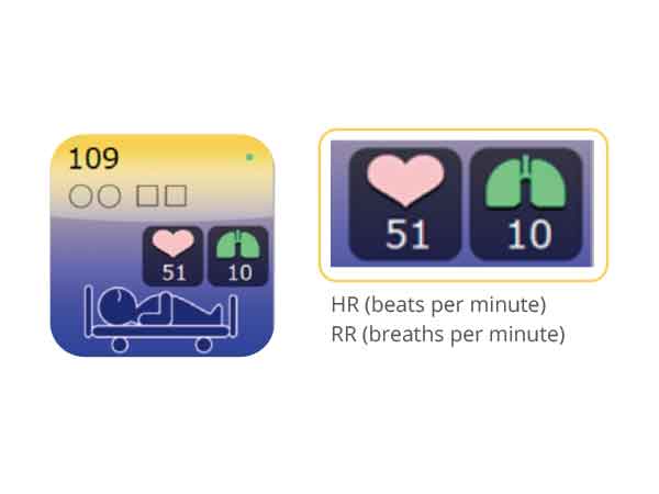 Heart rate(HR) and respiratory rate (RR) are also displayed to help caregivers respond quickly to patient’s condition change(s). If continuous measuring of HR and RR identifies paramaters outside the notification setting, the Nemuri SCAN sensor will send a notification through the central monitor and/or a mobile device to inform the caregiver.