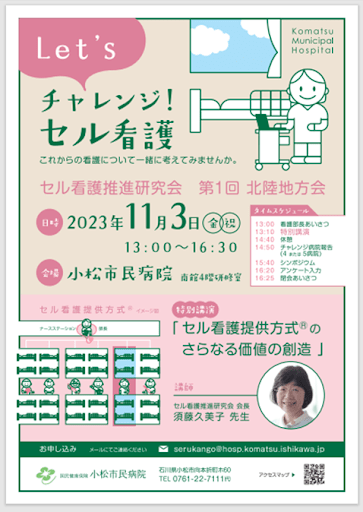 また、飯塚病院のご支援を頂き、2023年11月3日「Let‘s チャレンジ セル看護」と題してセル看護推進研究会第1回北陸地方会を開催しました。
