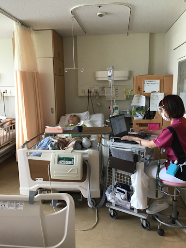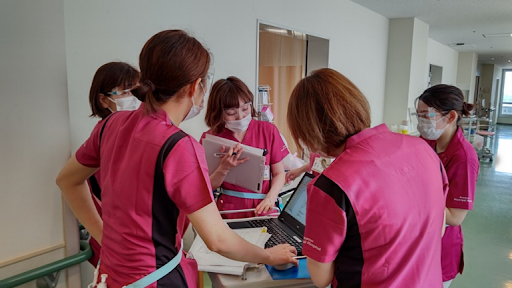 働き方改革の一環で2021年度に看護師の業務調査を行ったところ、16時以降の看護記録が時間外労働の主な要因だと判明しました。そこで、記録にかかる時間や記録するタイミング、記録すべき内容について改善するため、次世代型の看護記録システム「チームコンパス」(INNOXIA社)を2023年5月から使用しています。それ以降、記録を後回しにせず、廊下やベッドサイドでタイムリーに入力できるようになりました。この変化により、記録にかかる時間がグッと短縮され、時間外労働の解消につながりました。