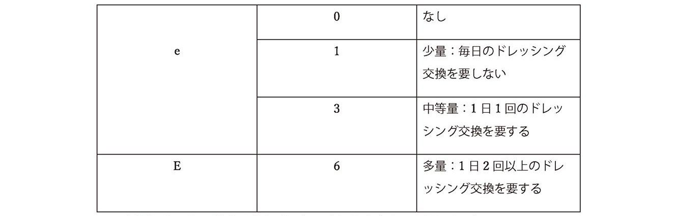 ドレッシングを交換した回数で判定。1日1回以下の交換であれば「e」。1日2回以上の交換であれば「E」とします。ただし、ドレッシング材料の種類は詳しく限定しないものとします。