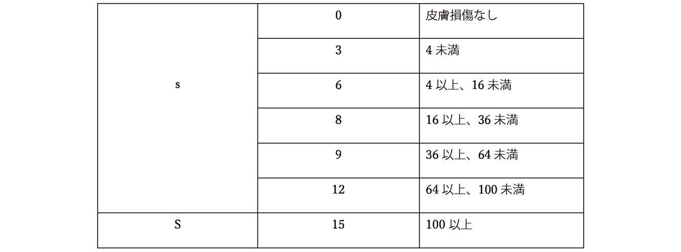 褥瘡の大きさによって判定。褥瘡の皮膚損傷部の長径と短径(長径と直交する最大径)を測定、それぞれを掛けた数値が100(cm)未満であれば「s」。100(cm)以上であれば「S」とします。ちなみに持続する発赤の場合も皮膚損傷に準じて評価されます。