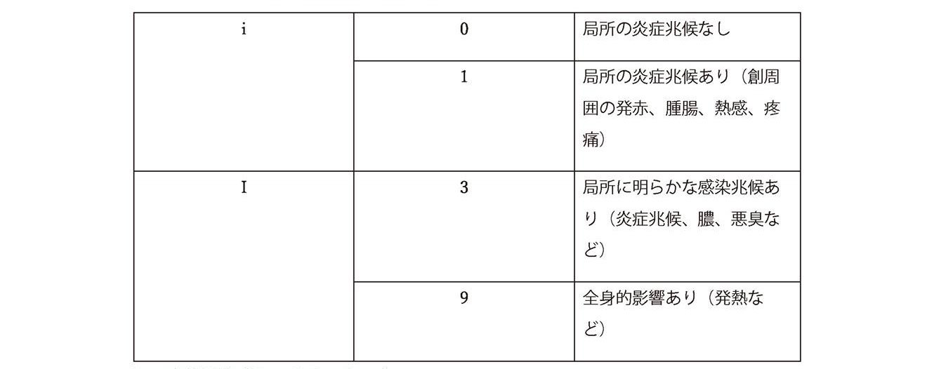 褥瘡局所部分に感染や炎症の兆候があるかどうかで判定。感染兆候がなければ「i」。あれば「I」とします。