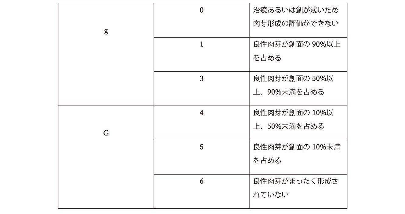 良性肉芽の割合を測定することで判定。良性肉芽の割合が50%以上であれば「g」。50%未満であれば「G」とします。ただし、良性肉芽とは、鮮紅色を呈する肉芽を表現するものであり、必ずしも病理組織学的所見とは限りません。また、真皮までだけの損傷時の場合、自動的に「g」と判定されます。