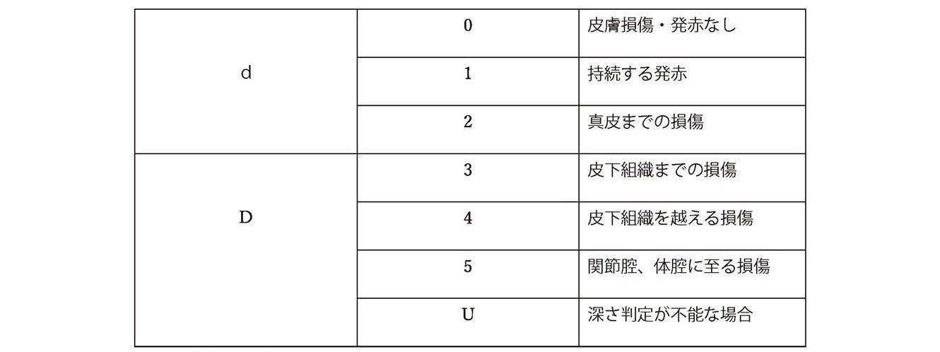 前項でも触れた「深さ(深達度)」による分類です。創内の一番深い部分で判定。真皮層と同等の肉芽組織が形成されている場合も含め、真皮全層の損傷までを「d」。皮下組織を超えた損傷を「D」とします。また、壊死組織のため、深さが判定できない場合も「D」の範疇に含まれます。