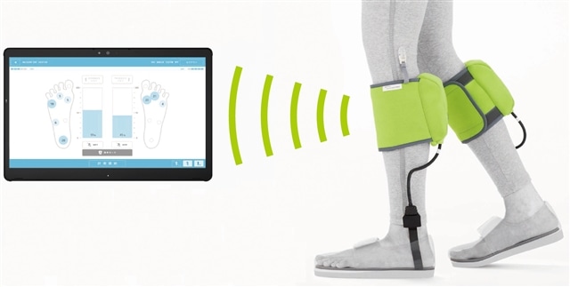 足底圧センサー「Waltwin」は、脳卒中や整形疾患、パーキンソン病などにより歩行機能に障害を負った患者の歩行訓練をより効果的に行うための製品です。インソール(靴の中敷)タイプのセンサー、無線通信機能をもつ中継ボックス、計測状況を表示・記録するタブレットPCで構成され、患者の履いている靴にインソールタイプのセンサーを入れてふくらはぎに中継ボックスを装着するだけで、歩行時の足底圧状況をタブレットPCに表示され、通常は目視できない足底圧の状況を客観的に把握できます。測定した内容は、患者、日付、動作などの項目ごとに整理して保存され、時系列での変化などさまざまな形式で表示することで、データに基づいた具体的なフィードバックが可能となります。より効果的なリハビリプログラムを作成できるほか、医師や介護職などの多職種間で情報を共有して、福祉用具選定の検討や介護計画の作成などにも役立てることが期待されます。
