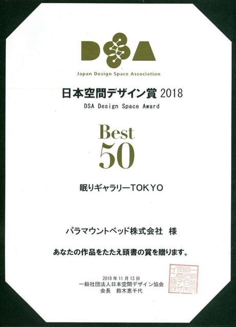 パラマウントベッド 眠りギャラリー TOKYO DSA日本空間デザイン賞の表彰状