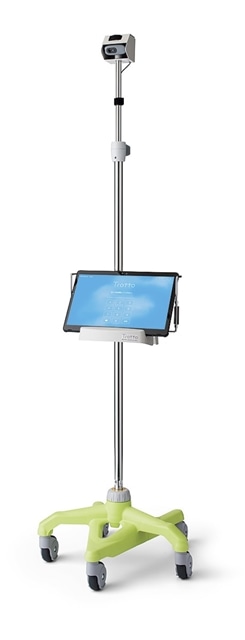 「トロット」は、キャスターが付いたスタンドにカメラ、タブレットパソコン(以下、タブレット)が装備された構造で、リハビリテーション支援を目的にカメラの設置、動画の撮影・再生・編集・管理を一貫して行えるシステムです。歩行、移乗、食事、書字、眼や口唇の動き、顔の表情などの各動作を上部や側面から3 つのカメラを使い撮影します。タブレットモニターにて、スタッフが撮影された映像を即座に患者と共有できるほか、動きや姿勢だけでなく、動作の所要時間、距離、角度などを測定し表示させることや、過去や目標の動作と比較しやすいよう並べて動画を再生させることができるため、患者の状態や変化を客観的に評価しやすくなります。撮影に必要だった機材や編集・管理機能が集約されたことで、動画撮影に関わる作業時間が短縮されます。