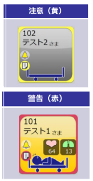 図1:見守り支援システムの入居者一覧表示画面。 図2:赤枠が警告表示(下)。