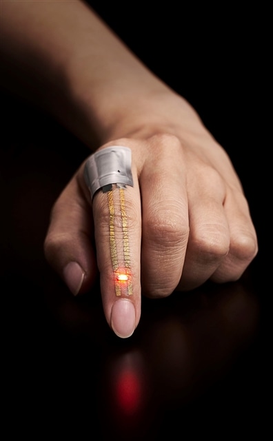 指の上部に貼られたスキンセンサーのイメージ。