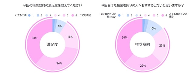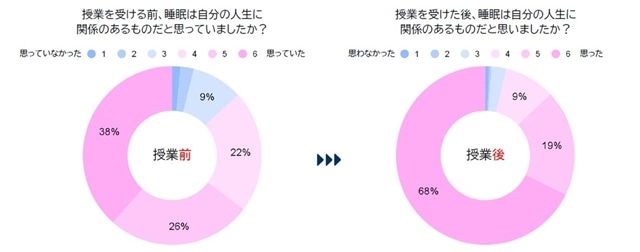 本プログラムを受けた生徒へアンケートを実施したところ、約 9 割の生徒から満足した、よく理解できたという評価がありました。また、授業前後で睡眠は自分の人生に関係があると強く感じた生徒が38%から68%へと高まっていることが分かりました。授業を実施した先生からも同様に高い評価となり、約 9 割の先生からほかの先生に推奨したいというアンケート結果になりました。