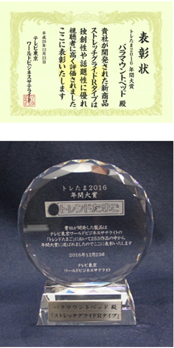 床ずれ防止マットレス「ストレッチグライドR(レスキュー)タイプ」が、テレビ東京系列で放映されている経済ニュース番組「ワールドビジネスサテライト」の「トレたま2016 年間大賞」を受賞しました。