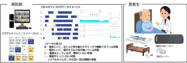 睡眠計測センサーを活用し、在宅患者の体調把握のため、ライフログデータを日々収集。また、日々の見守りや、夜間に長時間ベッドから離床されている患者・在宅高齢者等の訪問判断等を実施しました。