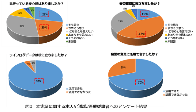 また、従来「定性的な観察結果」として得ていた睡眠情報が「定量的な連続情報」となって得られることで、在宅における患者の睡眠サイクルの把握につながり、患者や家族にとっても在宅生活をつづける上での安心材料になることが分かりました。医療従事者側も、独居や認知症等で本人・家族からの正確な情報収集が困難である場合でも、睡眠に関わる療養上の課題が明確になり、処方を含むケアプランの変更に役立てることができ、在宅におけるケアの質の向上にもつながったと考えられます。