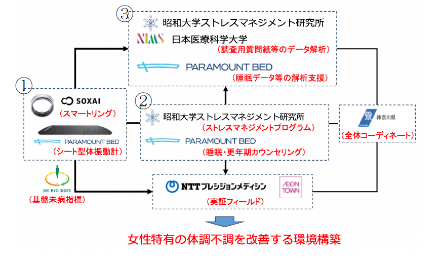 そのため、今回の実証事業では、女性特有の体調不調を改善する環境づくりの重要な要素として、睡眠やストレスに着目してその状態を可視化し、ストレスマネジメント等の心理的アプローチに基づいたオンラインによる介入プログラムを通じて、セルフケアの意識を高めていく未病改善スキームの構築を目指します。