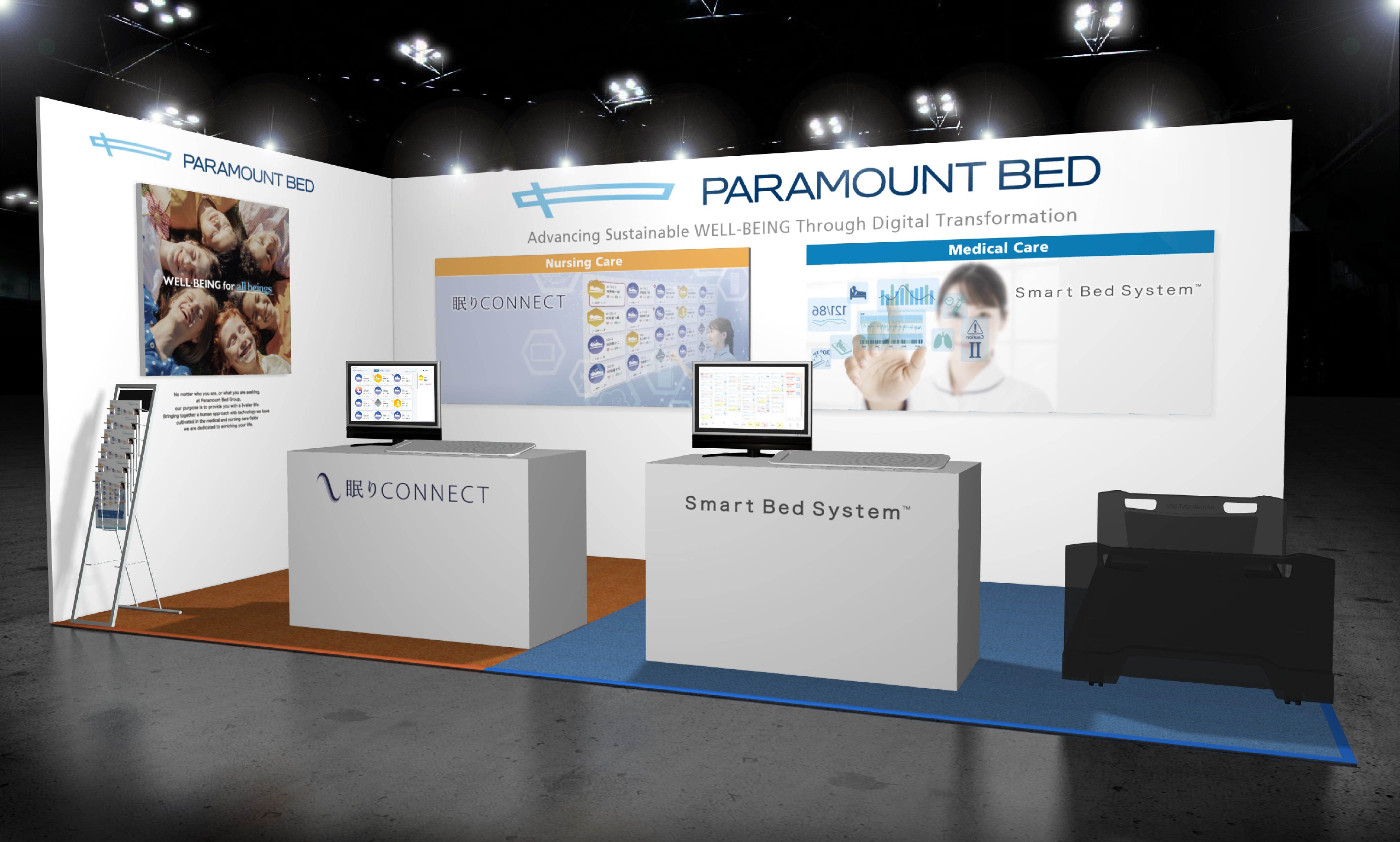 当社ブースでは、今月より販売を開始した、搬送アシスト機能付き「アリウスシリーズ ICUベッド」を展示いたします。本製品は、業界初となる左右方向のアシストが可能な「ParaDrive™」(パラドライブ)を搭載しており、ベッド搬送が安全・簡単に実施でき、医療従事者の身体的負担の軽減および業務効率化に貢献することを目指します。また、介護施設向けの見守り支援システム「眠りCONNECT」や、医療情報システムや各種測定機器と連携することで患者情報の一元管理を実現する「Smart Bed SystemTM」(スマートベッドシステム)、自動体位変換機能を備えたエアマットレス「ここちあ利楽flow」などの製品・技術を展示します。