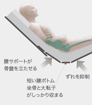 「楽匠Fit」シリーズは、従来のラクリアモーション※2を継承しながら、ずれ軽減と体圧分散を強化した新構造「フィットラインボトム」を採用しました。骨盤をしっかり起こす背上げ構造や腰部のサポート形状により、背上げ時のずれ量を軽減し、安定した姿勢保持を可能にします。また、ボトム臀部付近に搭載した凹形状は、仰臥位や背上げ時の仙骨部圧力にも配慮した設計で、床ずれリスクの軽減にも配慮しています。