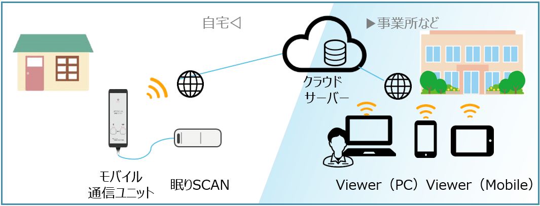 新サービスでは、携帯電話と同様にSIMカードを内蔵した「モバイルデータ通信ユニット」と「眠りSCAN」を接続するだけで通信が可能となります。取得された情報はクラウドサーバーに集約されるため、外出先でも専用アプリ「Viewer」を通じて情報の確認や各種設定が容易に行え、在宅環境においても「眠りCONNECT」の利用が可能となります。