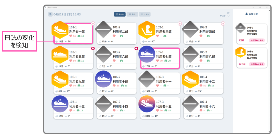 利用者の現在の状態(覚醒、起きあがり、離床など)を色と形で識別できます。利用者の状態変化や心拍数・呼吸数が、予め設定したしきい値を一定時間超えた場合には端末に通知されます。さらに、利用者ごとに状態変化からの経過時間も表示できるようになり、利用者状況に合わせた適時適切なケアサービスの提供につながります。