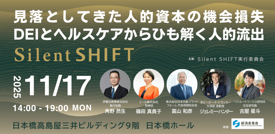 第1回カンファレンス「見落としてきた人的資本の機会損失 DEIとヘルスケアからひも解く人材流出 - Silent SHIFT」は、経済産業省の後援のもと、当社および陽と人が協力企業として参画する「Silent SHIFT 実行委員会」が主催します。株式会社Cradle、NTT PARAVITA株式会社、伊藤忠商事株式会社がパートナー企業として加わります。