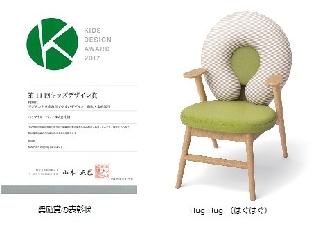 授乳チェア「Hug Hug」が、「第11回キッズデザイン賞」(主催:特定非営利活動法人 キッズデザイン協議会、後援:経済産業省、消費者庁、内閣府)において、同賞の上位賞である「奨励賞 キッズデザイン協議会会長賞」を受賞しました。