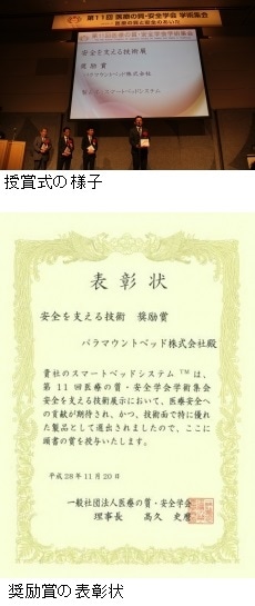 「第11回医療の質・安全学会学術集会」(11月19日~20日、幕張メッセ国際会議場にて開催)において、ベッドサイドケア情報統合システム「スマートベッドシステム™」が、医療安全を支える製品を表彰する技術展の最高位である「奨励賞」を受賞しました。当学術集会は、患者本位の質と安全を提供する新しい医療システムの実現を目的として、毎年開催されています。