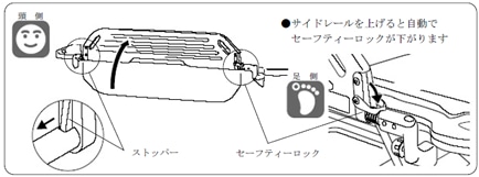 ストレッチャーをより安全にご使用頂くため、最新の製品よりサイドレール(機種によってはトランスファーボード)にセーフティーロック機構を追加し、標準仕様としました。セーフティーロック機構は、サイドレールのスライド動作を制限して不意のストッパー解除を予防するものです。