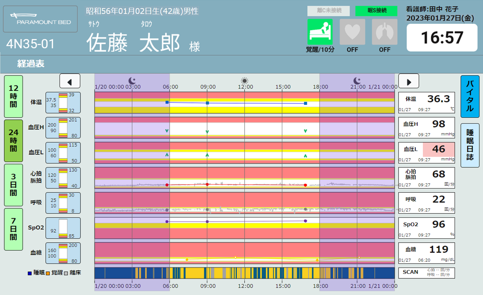 ・表示期間内の電子カルテに登録された各バイタルサインの値や、体動センサから得られた情報をグラフ表示します。
