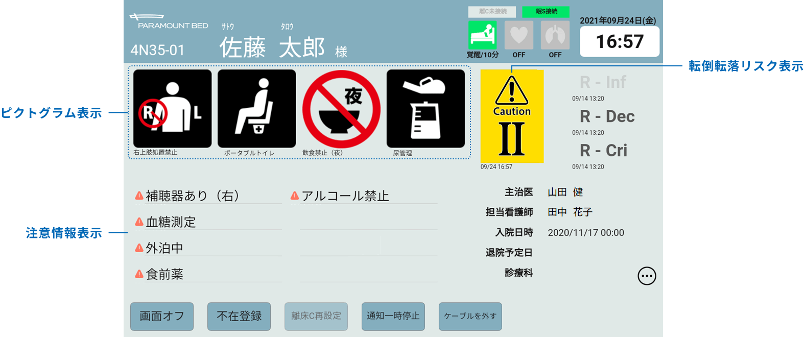 患者情報やピクトグラムをベッドサイド端末に表示することで、患者様の状態を関係者の間で共有できます。
