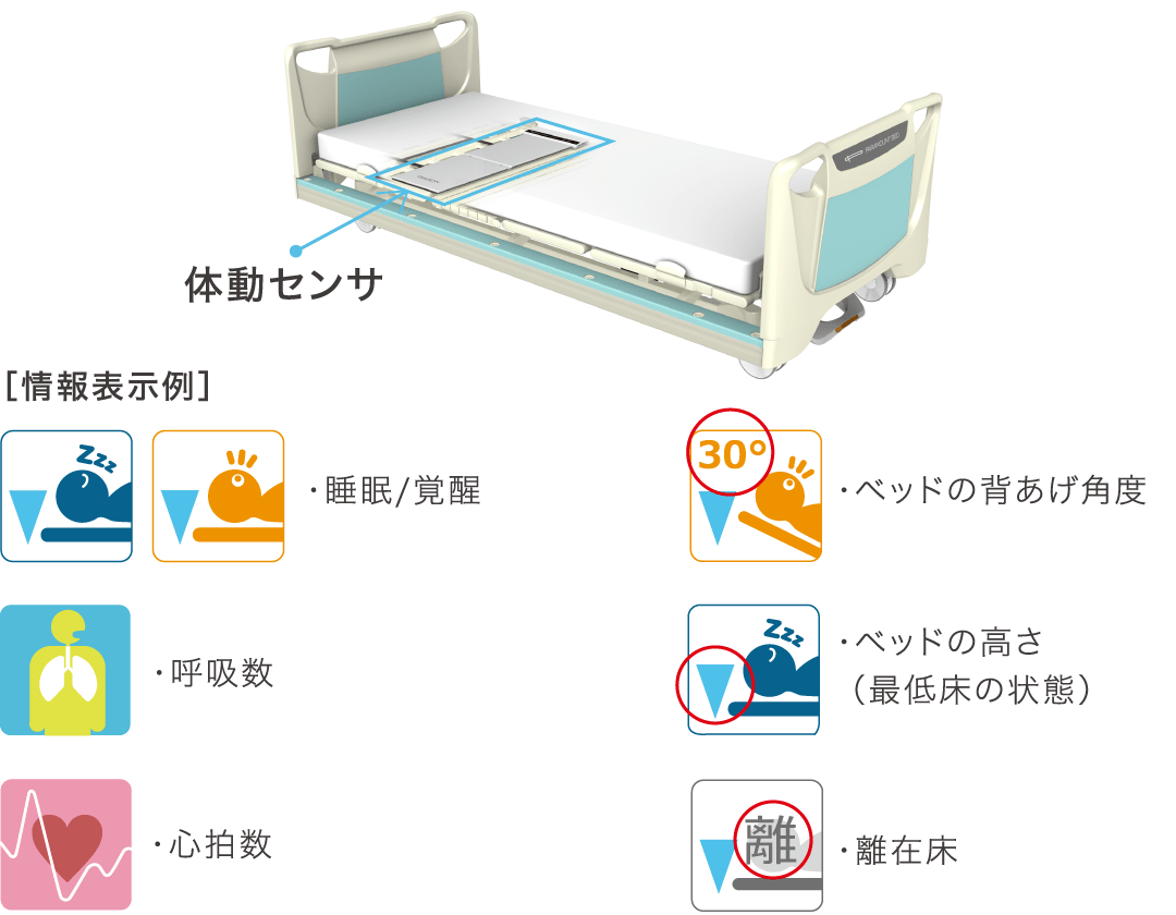 各センサから得られた睡眠・覚醒、呼吸数、心拍数など様々な情報を集約し端末に表示します。