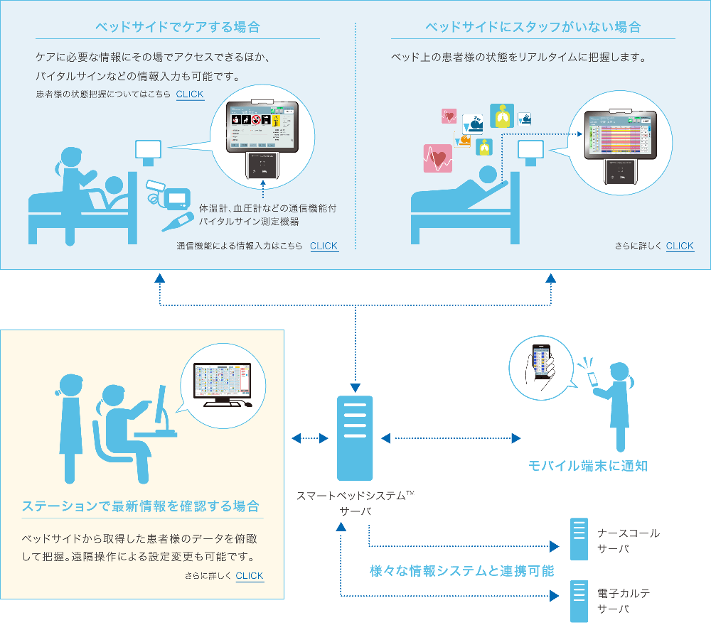 電子カルテシステムをはじめとする医療情報システムや各種測定機器、モバイル端末など、様々な機器間を連携。
