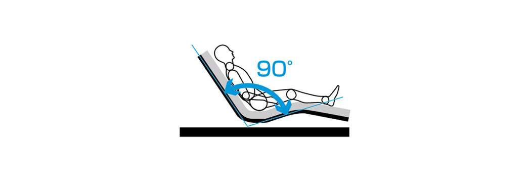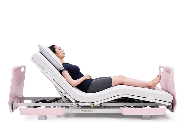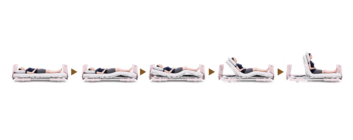 例えば、膝があがっている状態で背をあげた場合、背ボトムと膝ボトム間が約90°になるとそれ以上狭くならないように、膝を自動的にさげながら背があがります。ベッドポジションを操作するときに、背ボトムと膝ボトム間が必要以上に狭くならないように配慮した設計です。